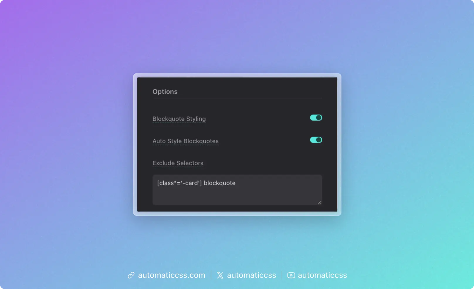 This gives you flexibility: enable automatic styling for convenience, or disable it if you prefer to manually control which blockquotes get styled using the .blockquote class.