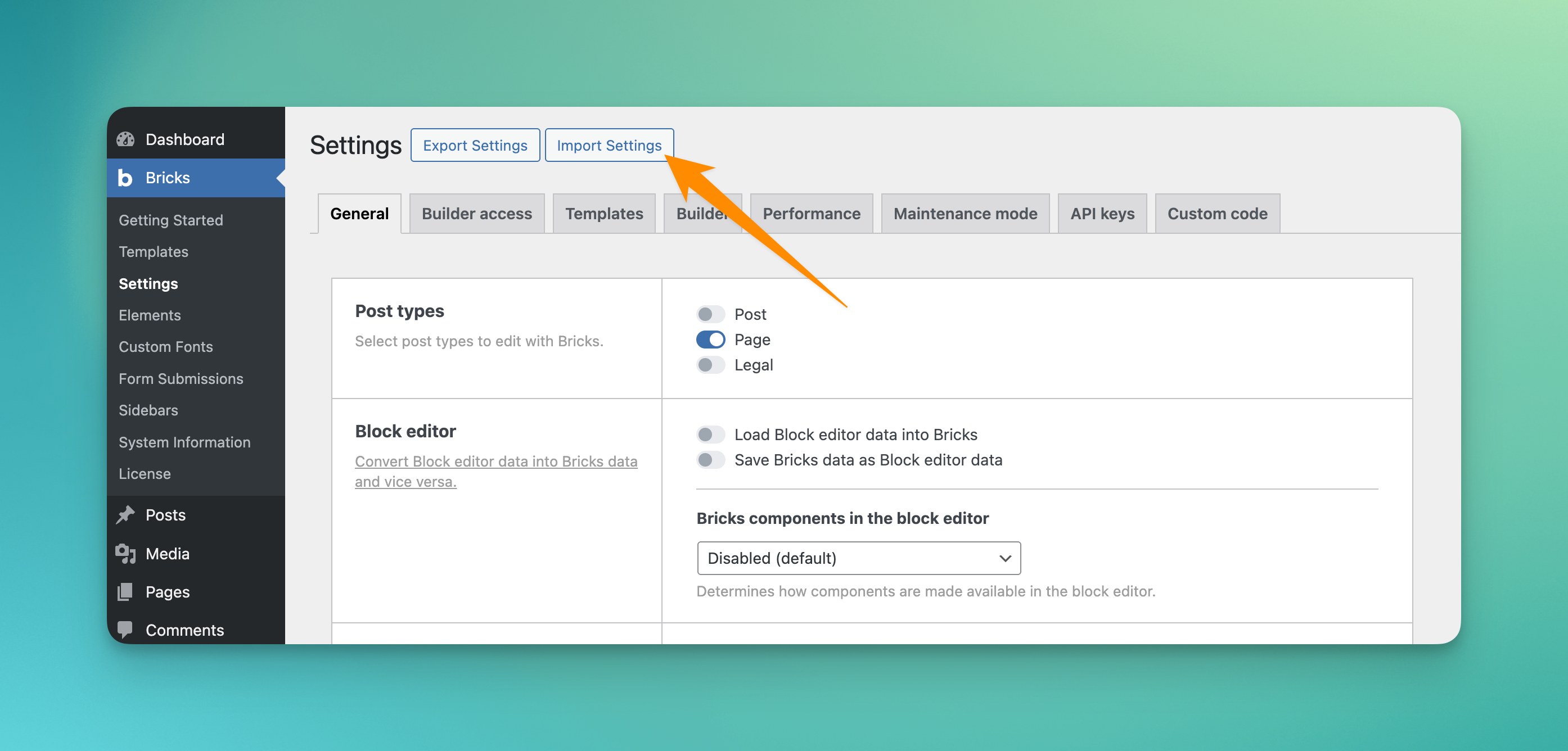 Navigate to Bricks > Settings in the WordPress Admin: